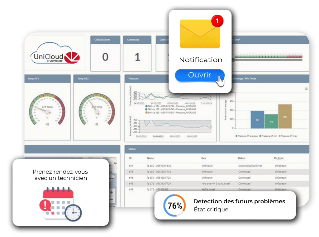 - Décelez les problèmes avant leur survenue : les alertes de notification automatiques sont rendues possibles en analysant les données de la machine.